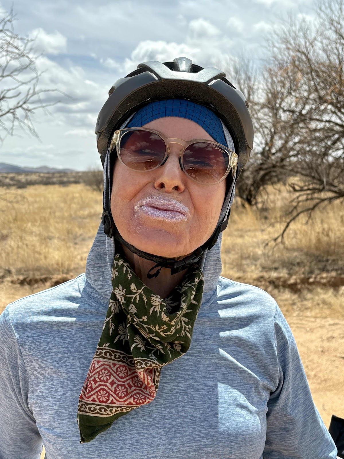 Back on Carson Gular Rd, we had a final 2 mile climb. There were a fare number of vehicles kicking up massive amounts of dust. It was also quite toasty. Still, I wore my buff to keep from inhaling too much dust. Near the end, Geraldine and Katie rode back to me, so we could finish all together.