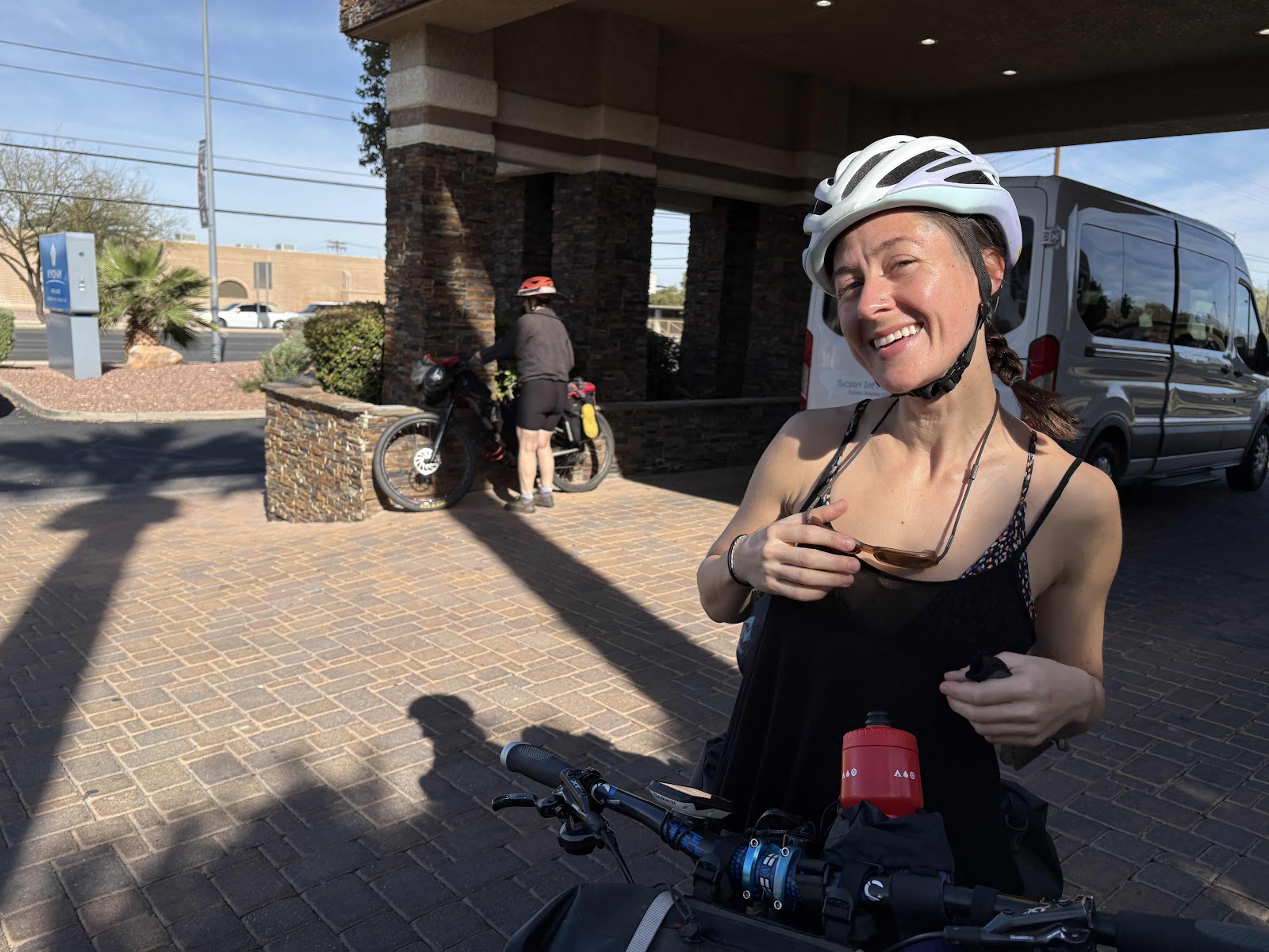 Jana had off and on derailleur issues, which we stopped to adjust periodically. We had to ride around the airport first.