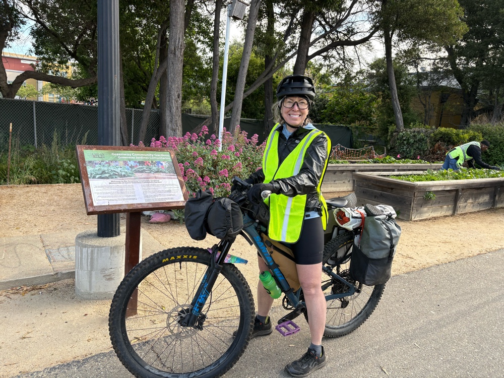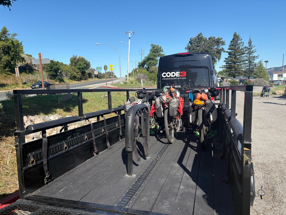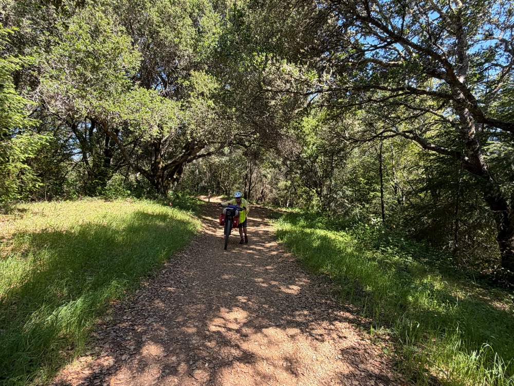 We finally made it to the hiker/biker site. I think it was about 6:00 ish. About a 9 1/2 hour day to go 37 miles of which a few of it was spent in a van crossing the bridge. Hopefully, tomorrow will not be so much pushing, although we know we will likely spend some time pushing in the morning up the Bolinas Ridge climb. But, in the meantime, it’s time to go to sleep and rest my weary back.