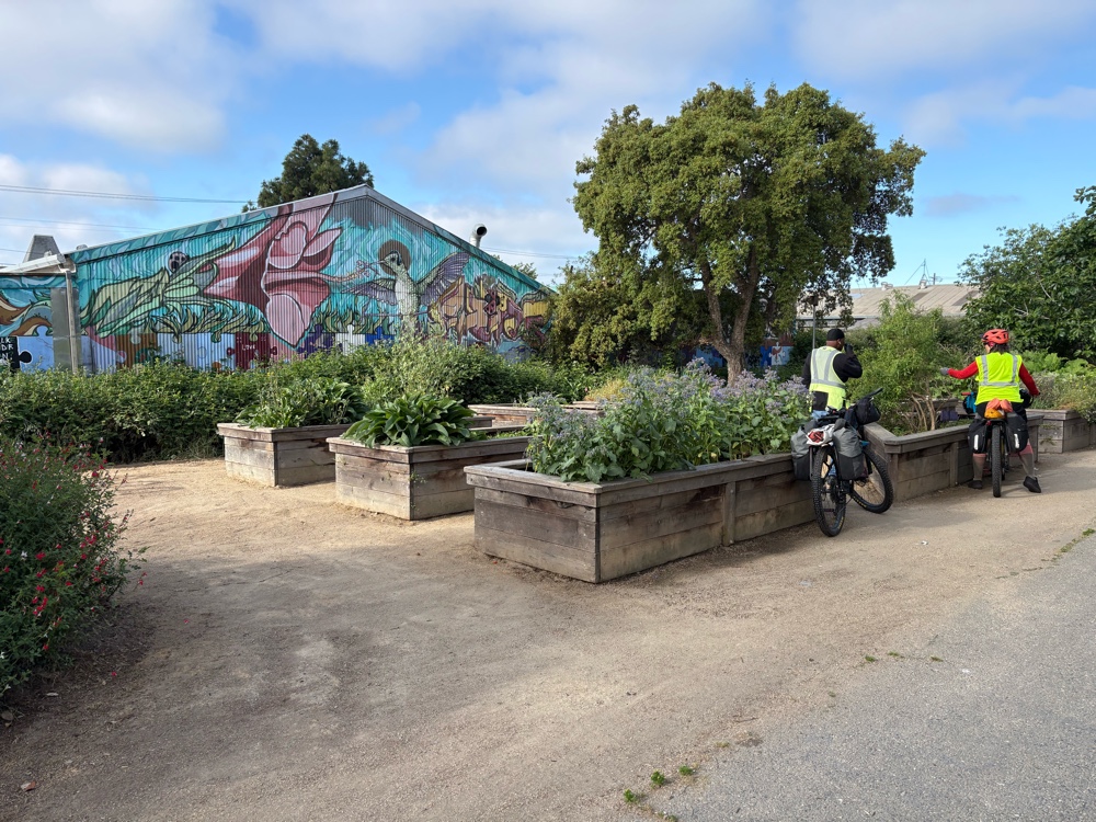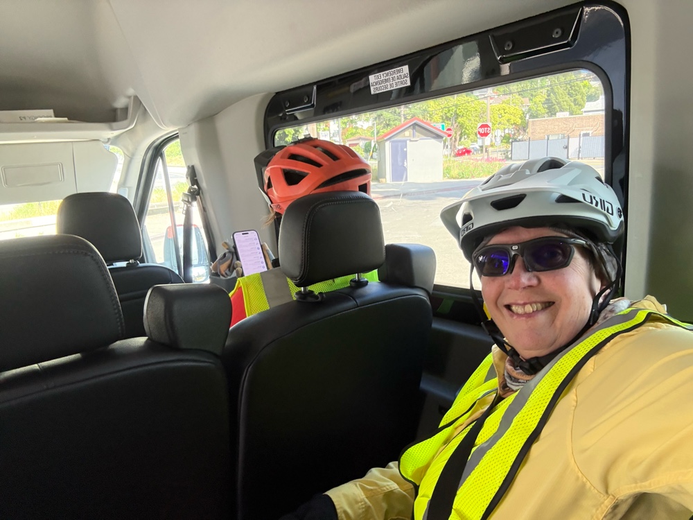 We off loaded at the other side, and continued on the route. We pulled into a town that I can’t remember the name. Catherine’s husband, Paul, was in the area, and offered to bring us donuts. We met him at Marin University campus. I was the only one who actually ate a donut. It was delicious.