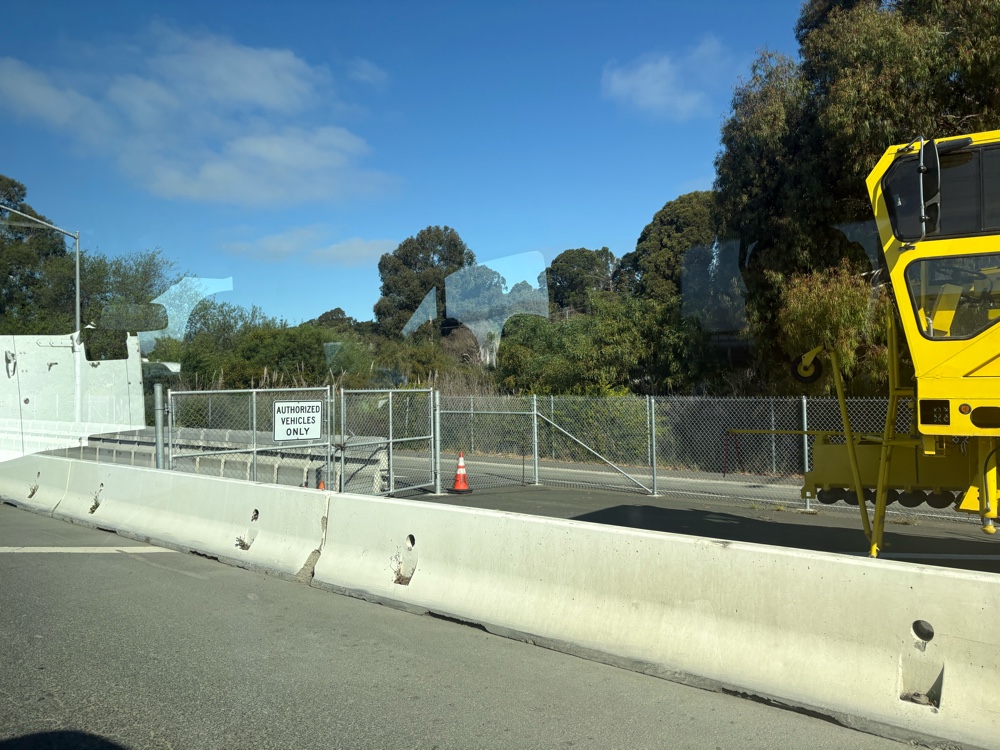 The crossing saved us a few miles of riding, but we were disappointed. The reason it was closed is because they are doing a pilot program where they push the bike path barriers to the side to create a break down lane on the bridge during certain days of the week.
